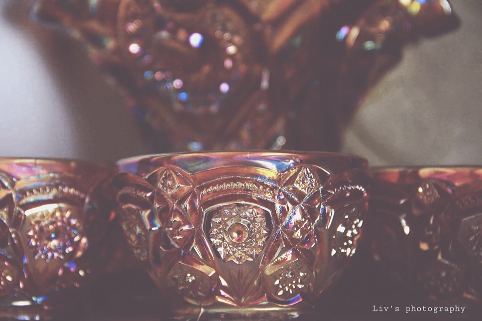 This is part of a punch bowl set, that was my great-grandmother’s. The base of the punch bowl can also be used as a candy dish. It is made of what they call carnival glass. My mom no longer has the punch bowl, because it mysteriously broke. My great-grandmother suffered from Alzheimer’s and Dementia, and when she was really getting bad, my mom was washing the set, being as extra careful as she always did, putting down towels, so that none of the pieces would touch any hard surfaces causing them to break. When she picked up the punch bowl to wash it, it did not touch anything, yet it shattered. She noted the time on the clock thinking that she would come to find out that my great-grandmother had passed, but that was not the case. She still does not know why it broke like that, and she was not injured as well.