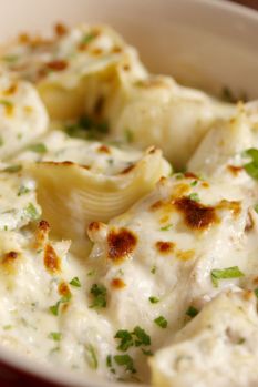 Chicken Alfredo Stuffed Shells. This were really good, and I just thoroughly impressed my kids. (it must have been the fresh parsley I used as a garnish on top). Very good flavor, and pretty simple to make. Ben, my Chopped guy, sat down with his plate and said, “Isn’t this fancy? Maybe a little too fancy.”