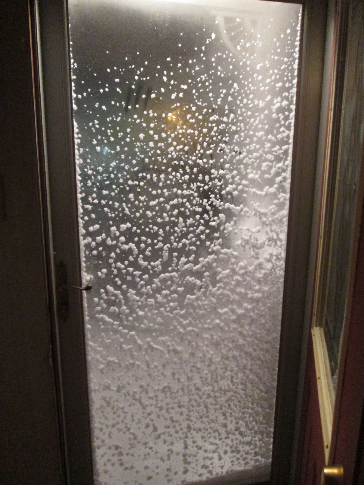 I see a lot of snow, snow drifts, and our neighbors digging themselves out. But the snow is so beautiful glistening in the sunlight. The sunshine is nice today…but that also means 6 more weeks of winter, since the groundhog saw his shadow. The way the wind was blowing last night, we could not see out our front windows. This is what our front door looked like last night.
